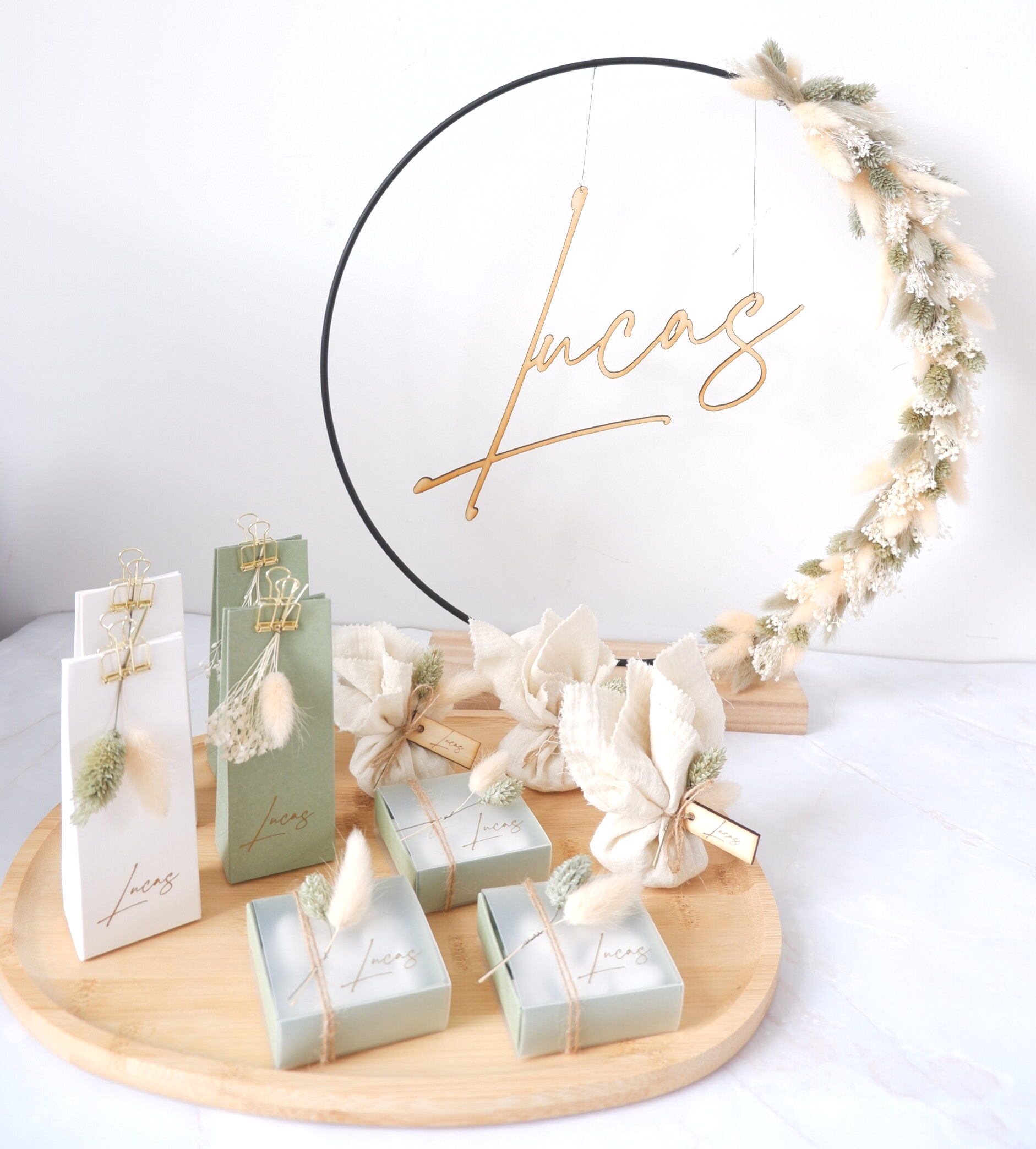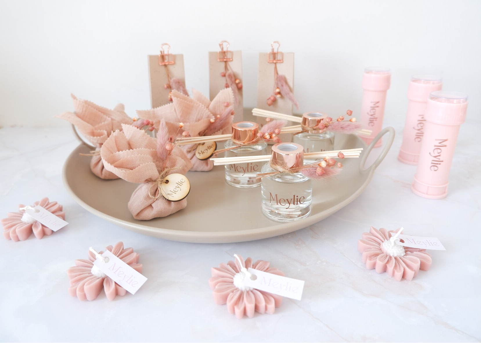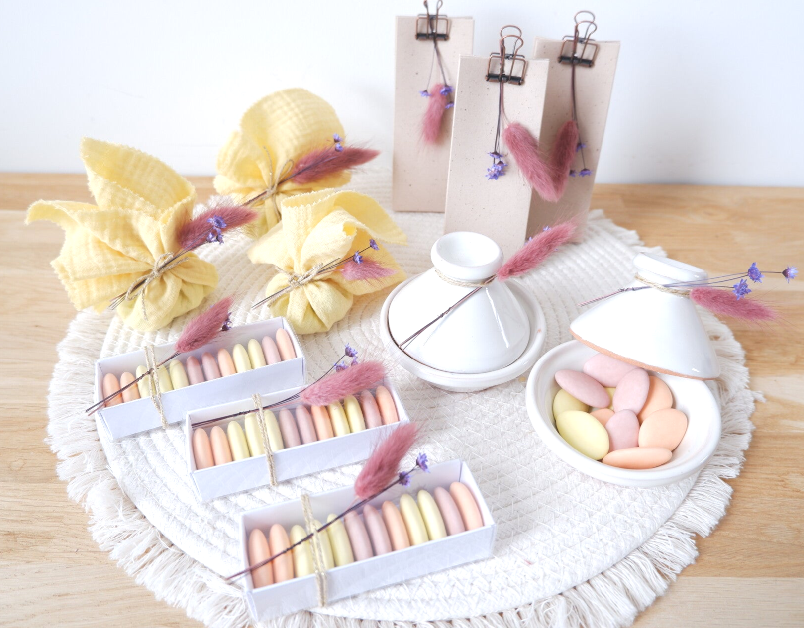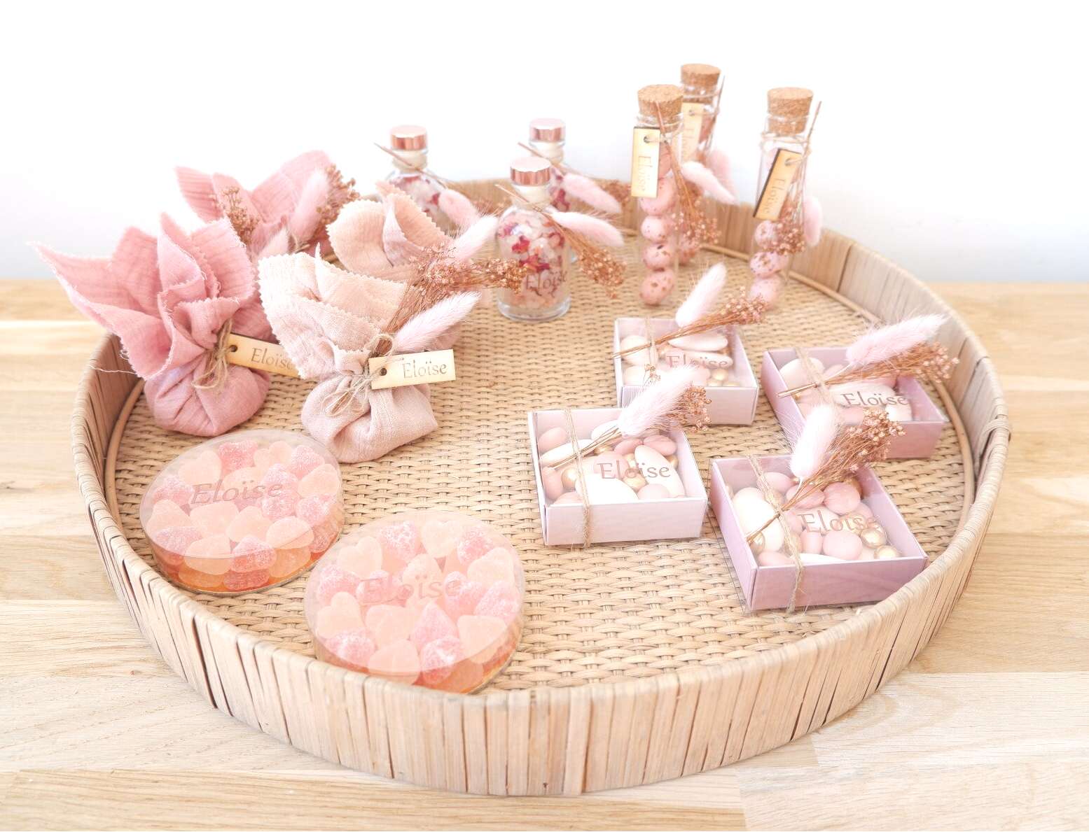 Voor een mooi en harmonieus geheel raad ik aan om 3 à 5 verschillende bedankjes te kiezen. Dat zorgt voor variatie en een stijlvolle presentatie.