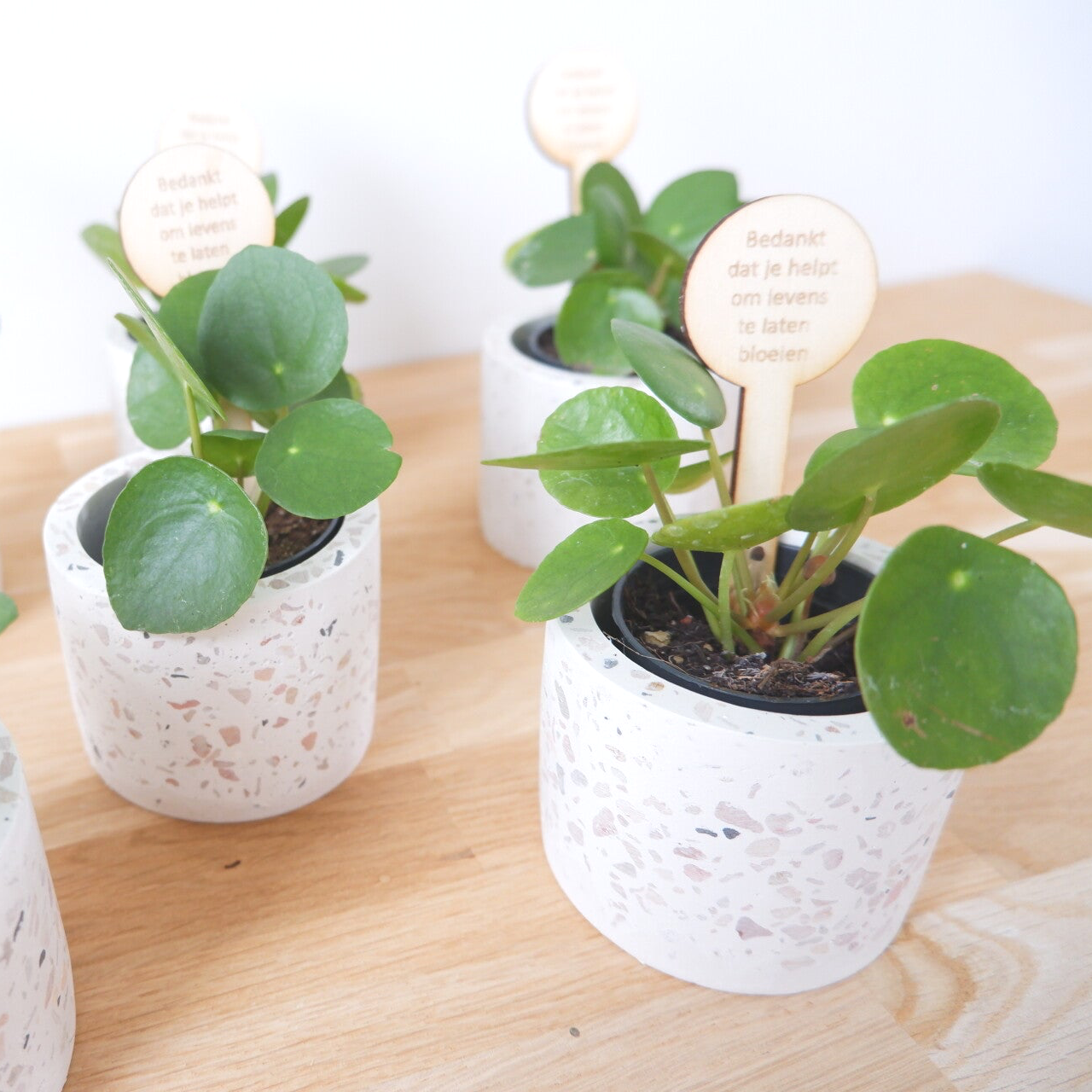- De bloempotjes worden standaard geleverd zonder plantje. Met plantje kan enkel indien er gekozen wordt voor afhaal.