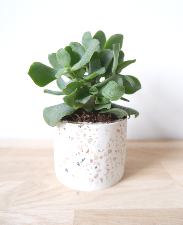 Dit terrazzo bloempotje is een stijlvol en modern detail dat perfect past bij verschillende feest- en interieurstijlen. De subtiele spikkels geven het potje een speelse en elegante uitstraling.