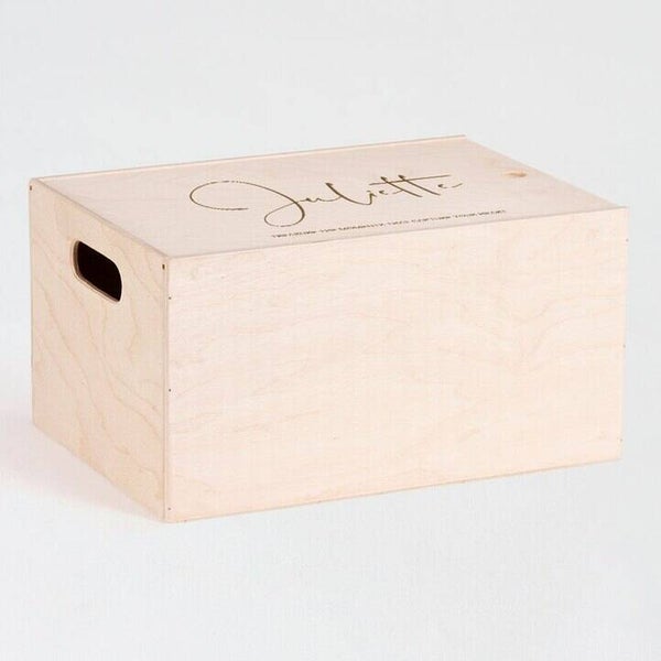 Deze doos kan je personaliseren met naam, geboortedatum of een korte tekst.