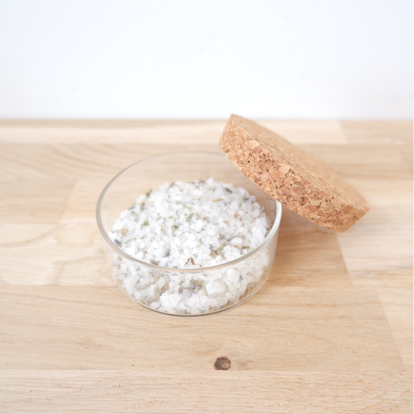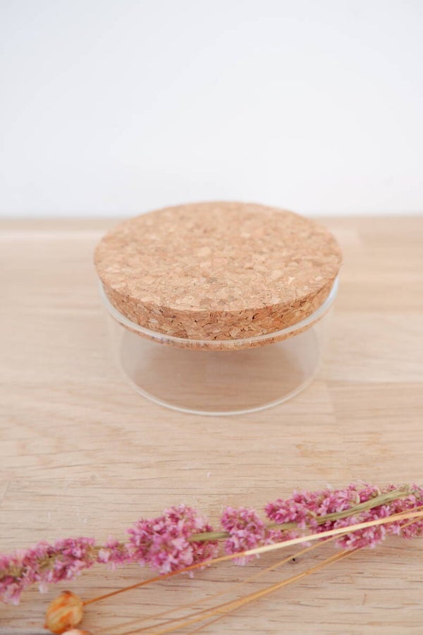 Glazen potjes met kurken deksel, leuk om te vullen met suikerbonen, badzout, zeepvlokken,...