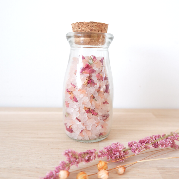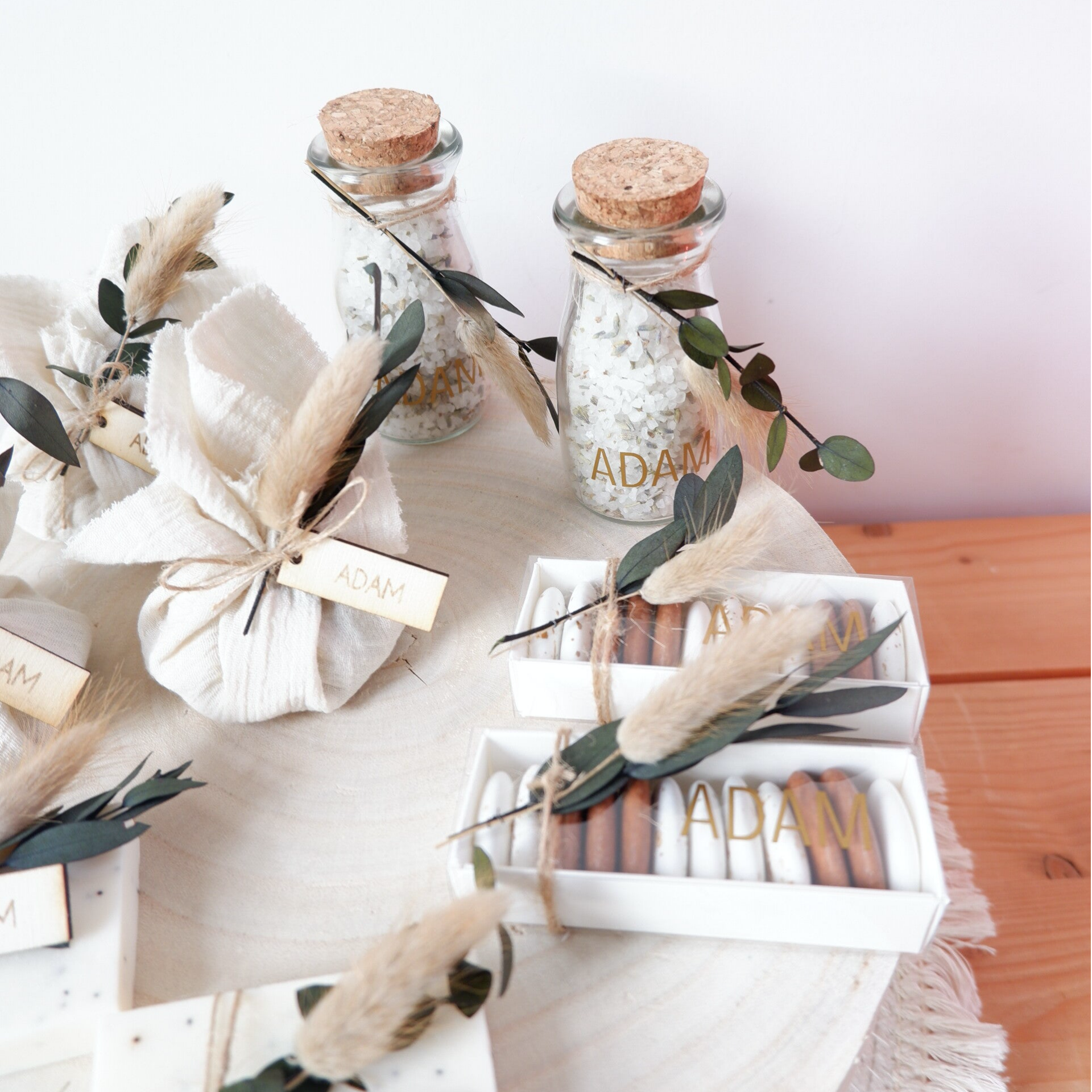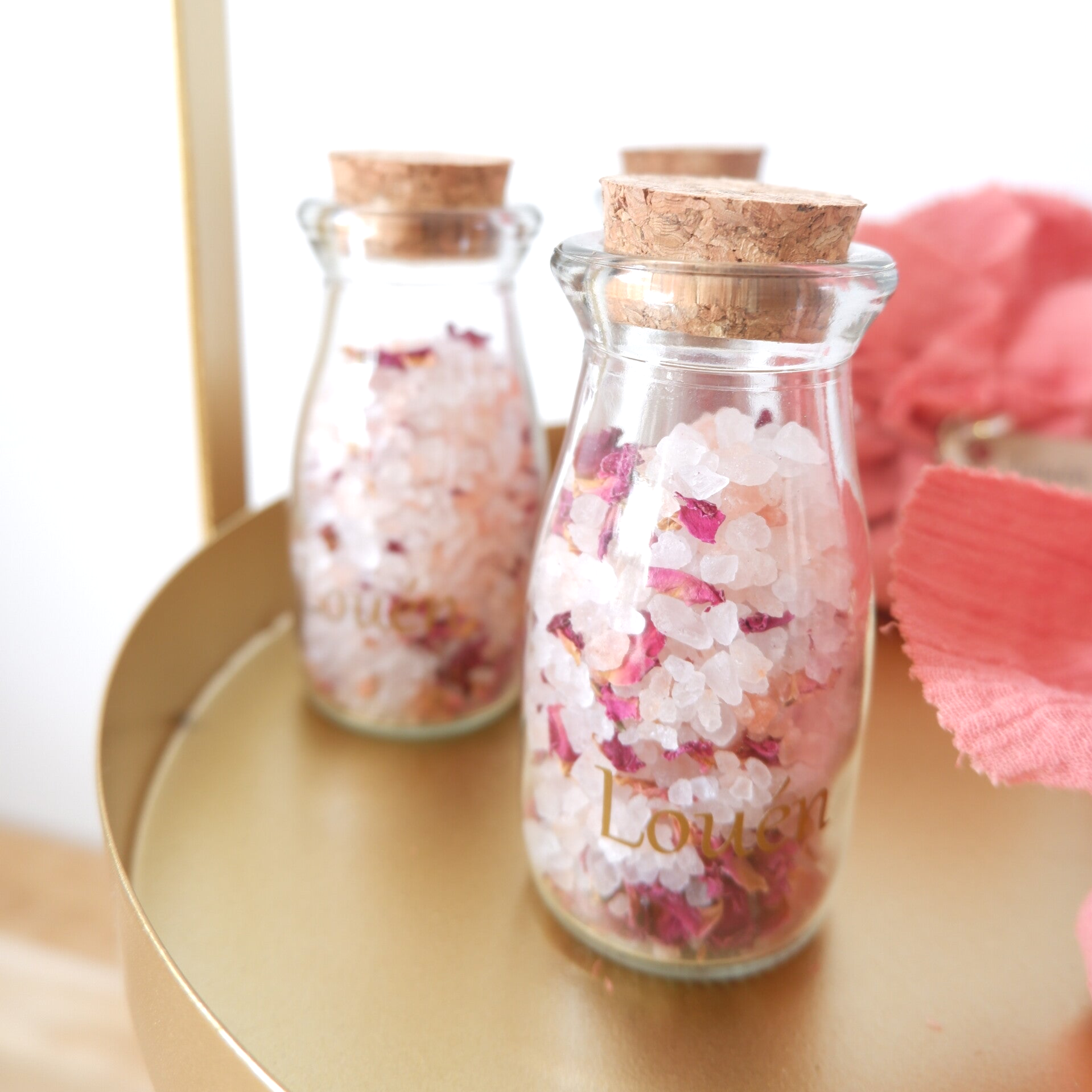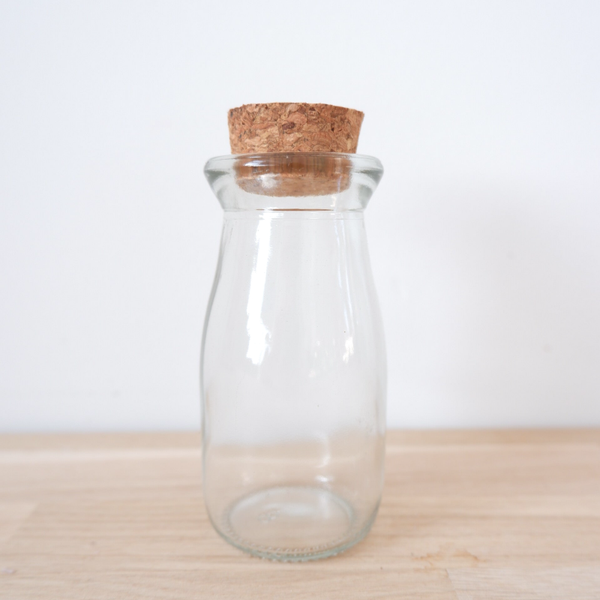 Glazen flesje met een kurken stop. Past leuk in een doopsuikergeheel, ook tof om te geven als bedankje bij een communie/lentefeest of huwelijk.