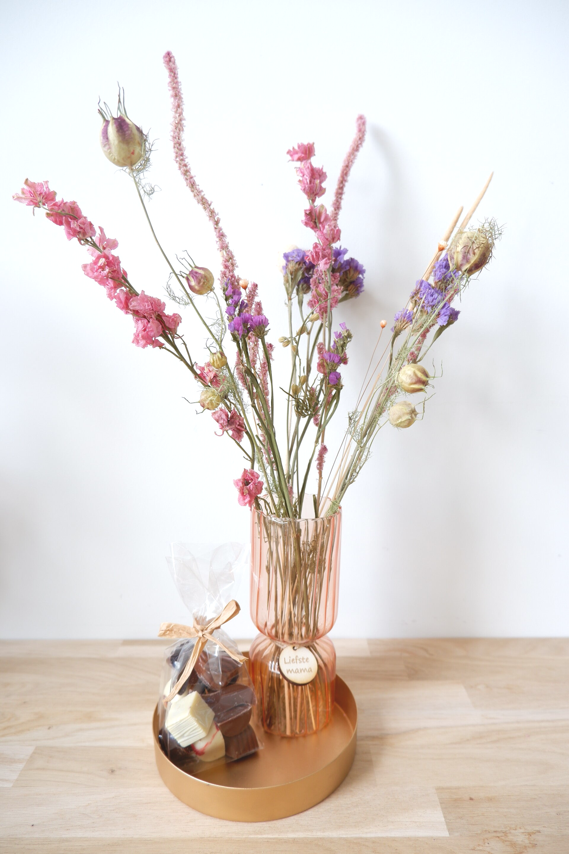 Voor het vaasje kan je kiezen uit 3 verschillende kleuren, ook van de droogbloemen kan je de kleur zelf kiezen.