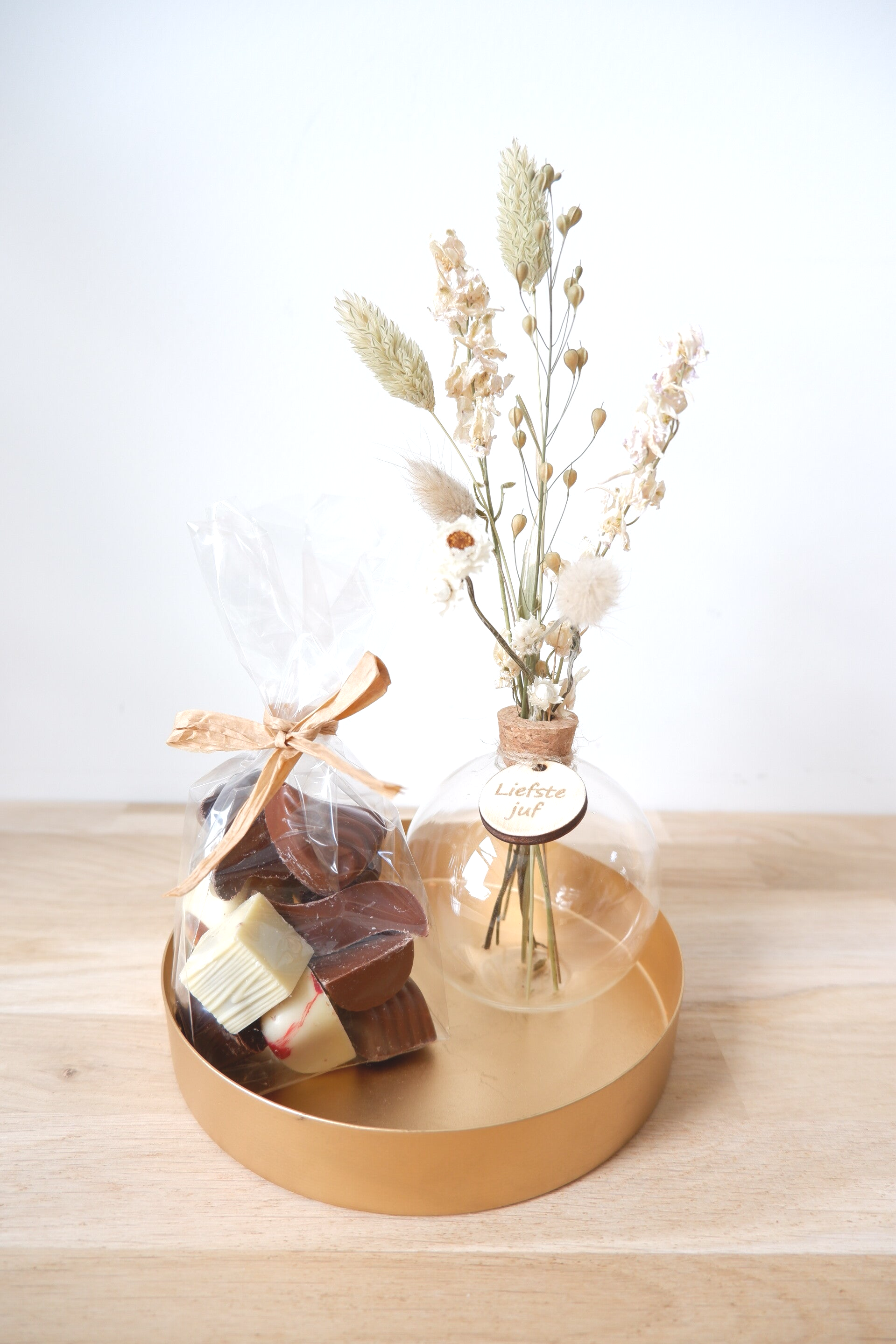 - Cadeausetje bestaat uit een gouden dienblad, zakjes pralines +/- 120gr, vaasje en droogbloemen in kleur naar keuze, afgewerkt met houten plaatje.