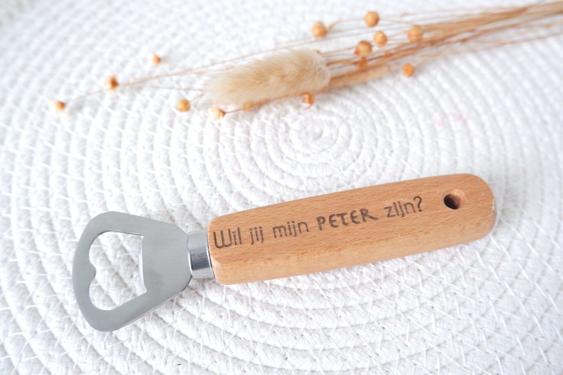 Met deze handige flesopener vraag je de peter van jullie kindje op een originele manier.