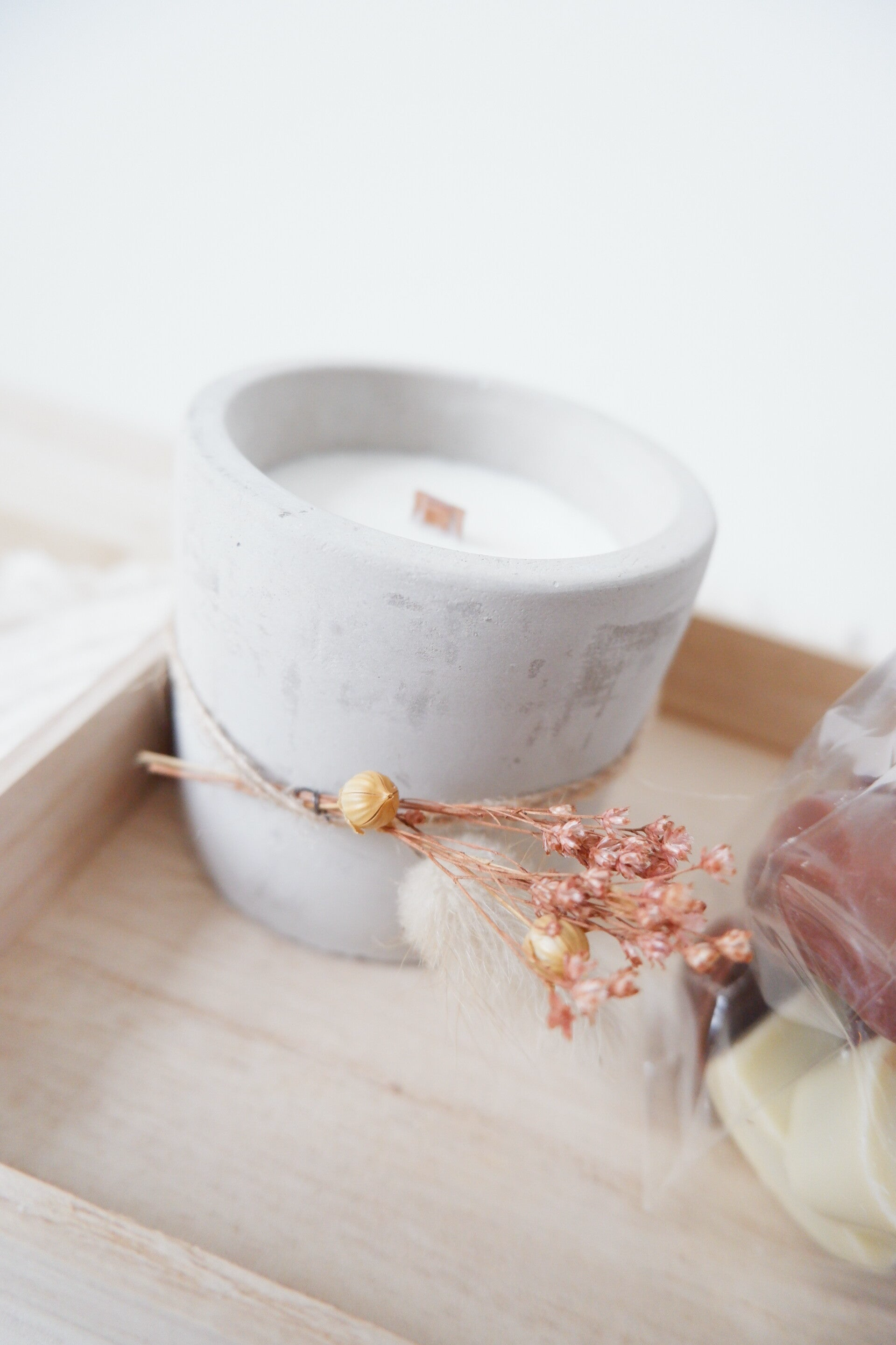 - Kaars met houten wiek in betonnen potje. Dankzij de houten wiek heeft deze een lange brandtijd,