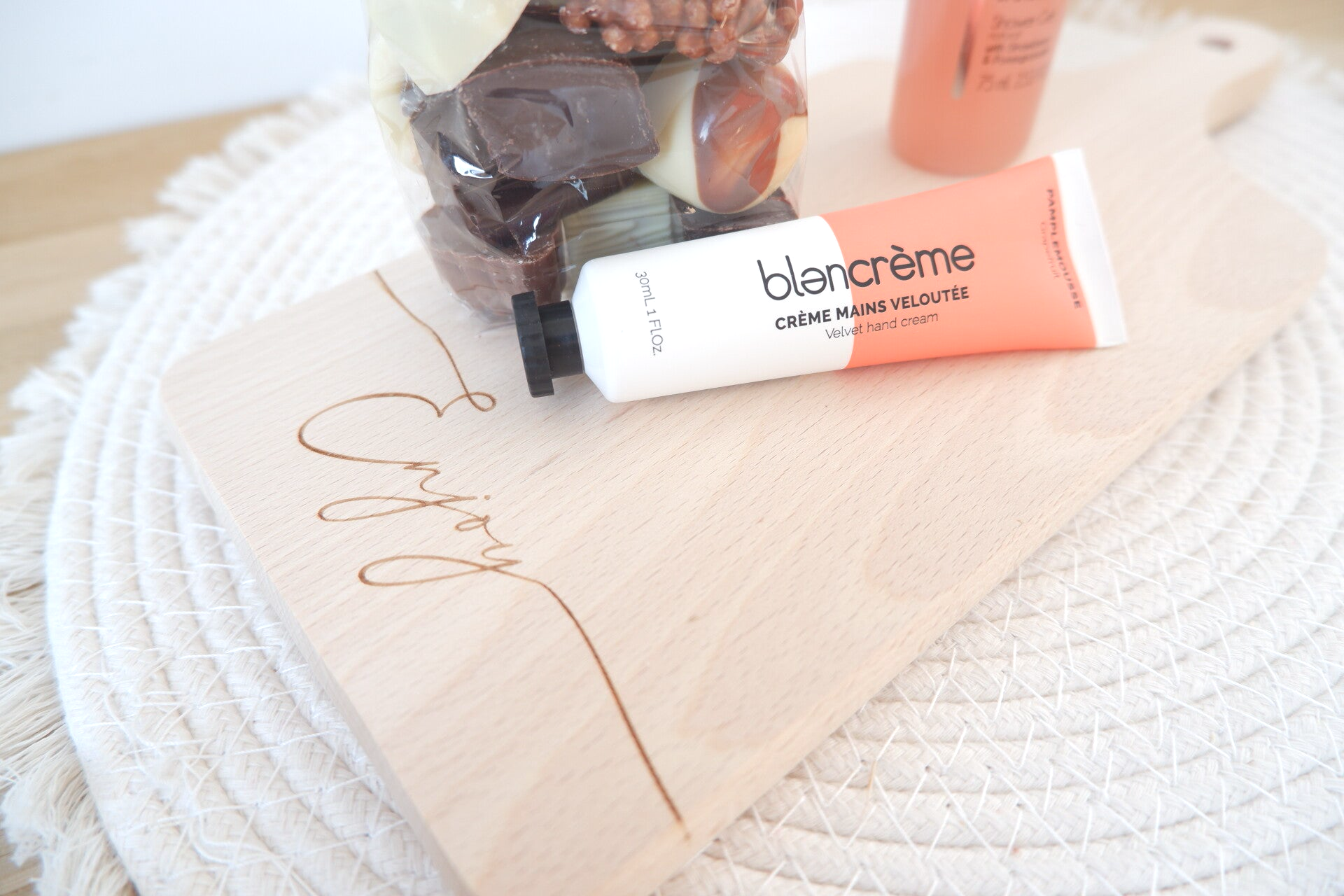 - Gepresenteerd op een broodplankje, gegraveerd met 'enjoy'
