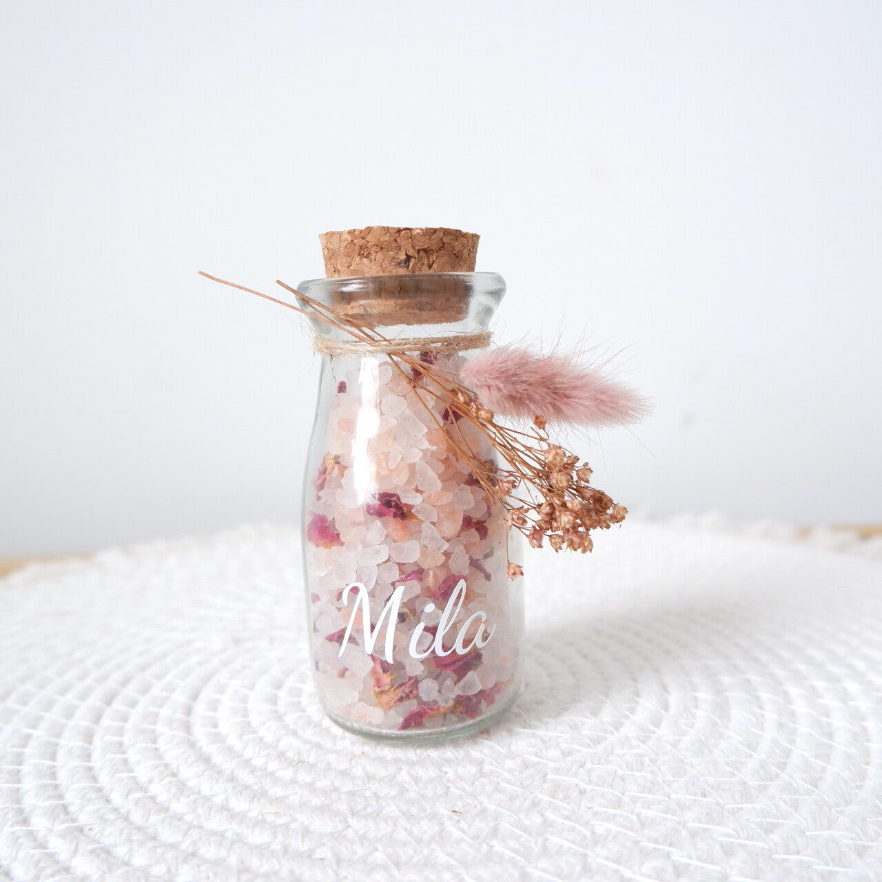 - Gevuld met +/- 100gr grof badzout, roze met rozenblaadjes.