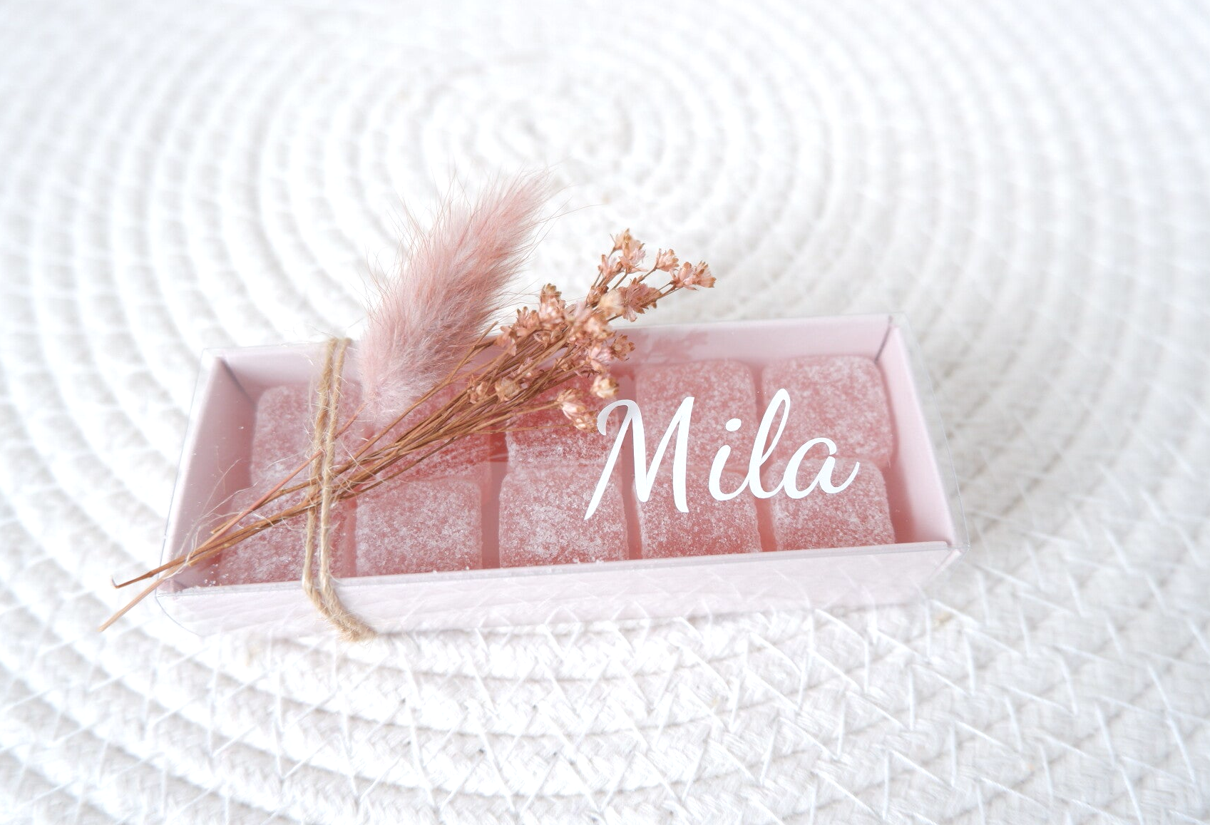 - Gevuld met 10 roze snoepblokjes, smaak perzik
