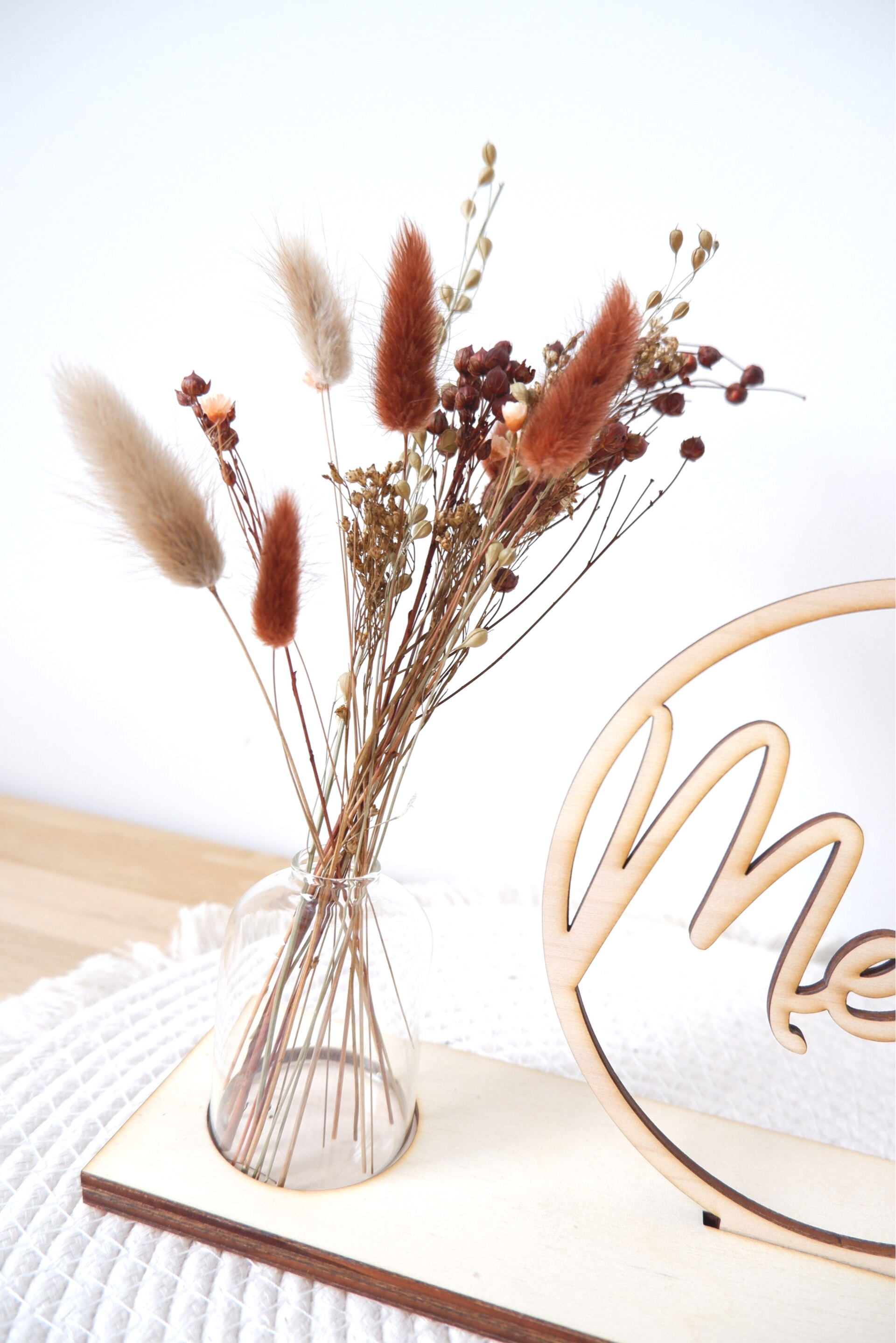- Transparant vaasje gevuld met droogbloemen in kleur naar keuze.