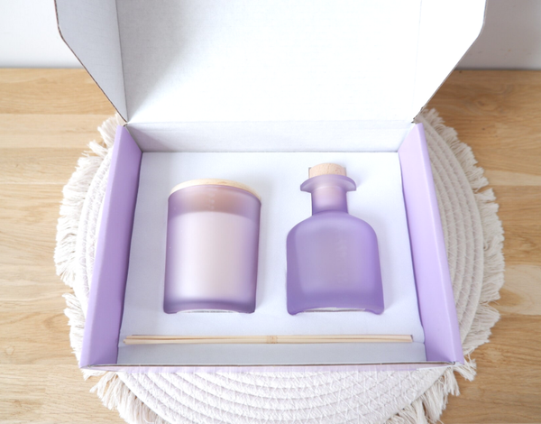 De box is gevuld met een geurkaars en een huisparfum met diffuser. Zowel de kaars als de diffuser hebben een mooie matte lila kleur. Met de combinatie van het stijlvolle design en de heerlijke geur creëer je eenvoudig een gezellige sfeer in huis.