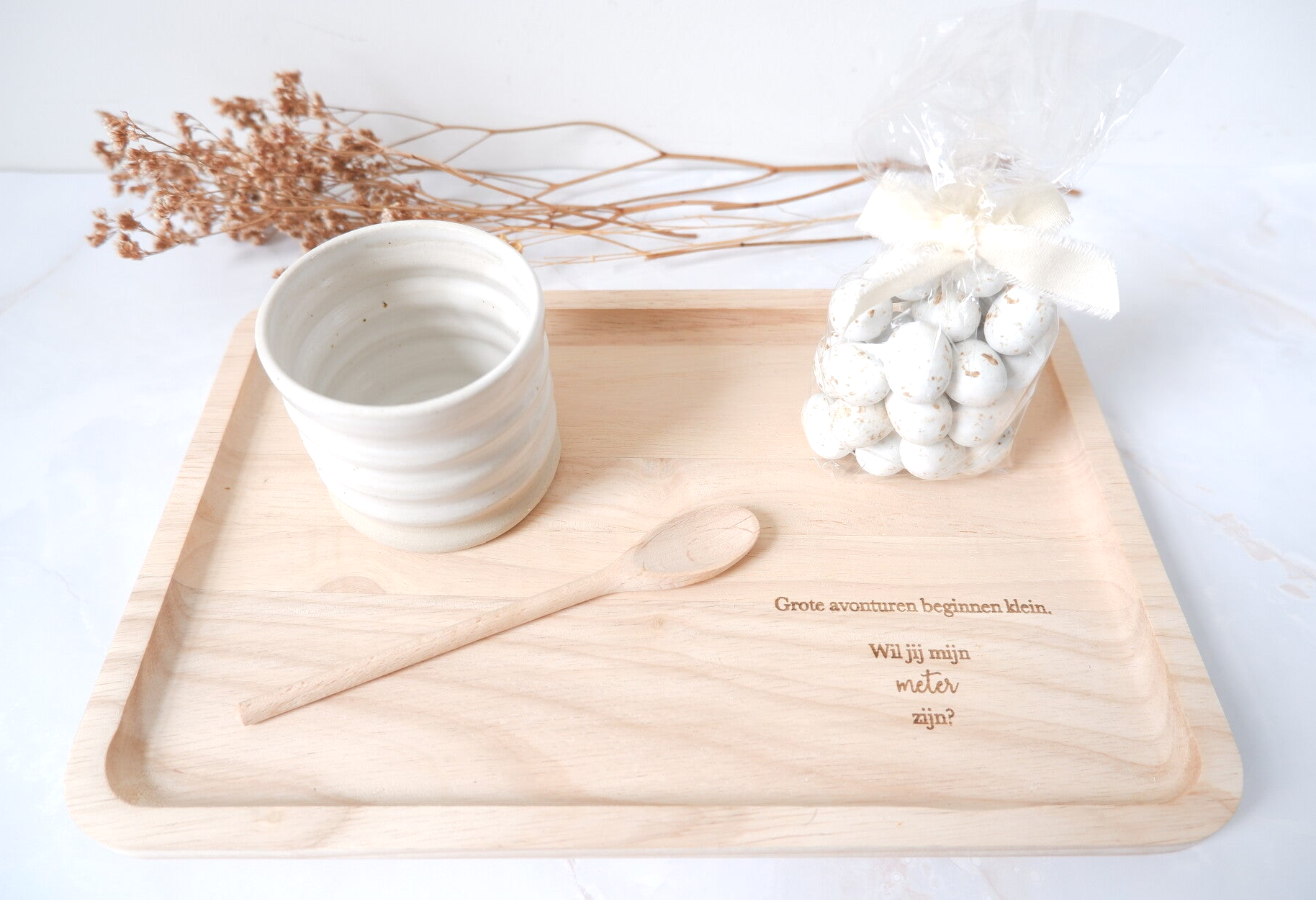 - Dienblad gegraveerd met geribbelde mok keramiek, zakje 150gr cookie choc's, lepeltje.